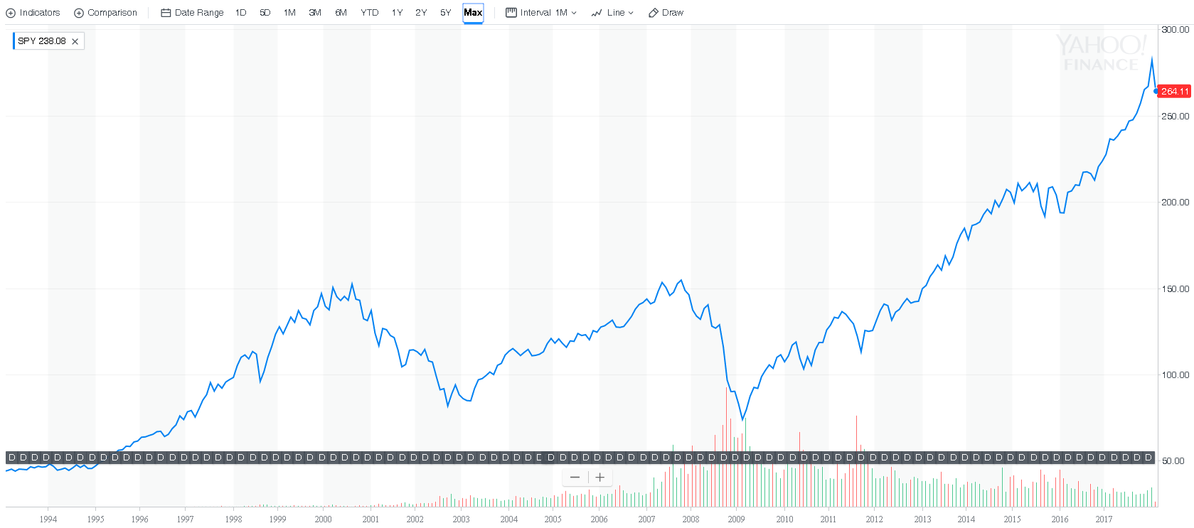 Over een langere termijn van bijvoorbeeld 4 jaar zie je dat dit voor de S&P 500 een redelijke dip is, vergelijkbaar met de zomer van 2015. In dit jaar was het rendement van de S&P 500 1,34%, in vergelijking met de 21,69% van 2017 een enorm verschil. In januari 2016 liet dit fonds ook een soortgelijke dip zien.